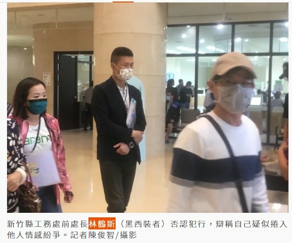 新竹縣工務處前處長林鶴斯(黑西裝者)否認犯行,辯稱自己疑似捲入他人情感紛爭。記者陳俊智/攝影