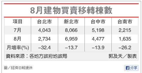 根據昨天各縣市政府公布的8月買賣移轉棟數,和7月相較,台北市月減32.4%、新北市月減13.7%,台中市月減13.9%、台南市月減26.2%,房市交易量重挫,各界開始擔憂,房價愈漲愈高,不動產交易追價續航力不足。