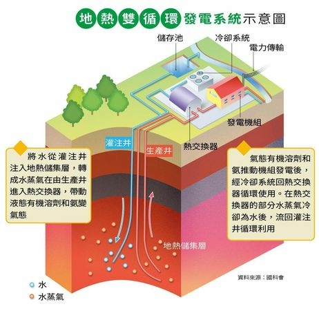 工研院綠能與環境研究所李伯亨博士指出,地熱發電是利用存在岩層裂隙中的高溫熱水當作介質,透過鑽井開採,把熱液和蒸氣導引至地表,運用蒸氣直接推動渦輪,或採用雙循環系統,帶動發電機產生電力。