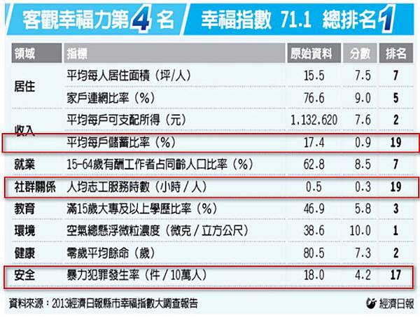 此外,澎湖縣排名第2,已連3年名列前3名,可謂幸福常勝軍;花蓮縣,排名第3,客觀幸福力上升,環境品質滿意度最高。