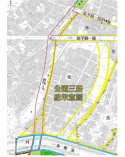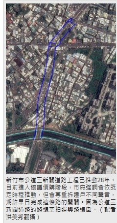 新竹市公道三新闢道路工程已推動28年,目前進入協議價購階段,市府強調會依既定時程推動,但會尊重拆遷戶不同聲音,期許早日完成這條路的開闢。圖為公道三新闢道路的路線空拍照與路線圖。(記者洪美秀翻攝) 竹市公道三用地徵收案過關 預計7月動工明年底完工 | 桃竹苗 | 地方 | 聯合新聞網