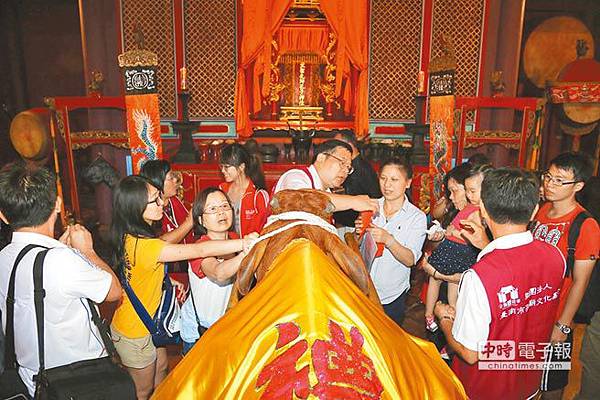台南孔廟仍保持傳統禮儀,以真牛、真豬、真羊祭孔,更吸引許多家長、學生爭拔智慧毛。(曹婷婷攝)