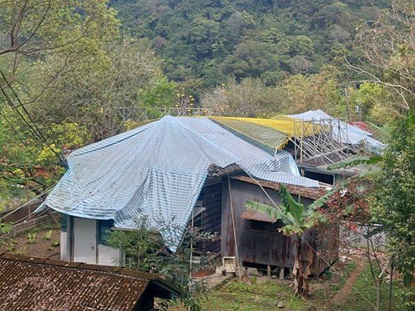 文化局表示,已完成棚架、防護帆布、PE防護網、鋼管鷹架等緊急防護工作,並定期檢查防治作業及補充藥餌,以免內灣派出所繼續傾塌。圖/新竹縣文化局提供
