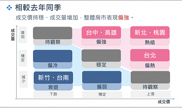 台北市較去年同季「表現偏熱」,因高價區推案較多,致成交價大幅上漲;由於素地稀缺,危老都更案頻創高價,精品小宅總價控制產品成為推案趨勢,形成單價上漲、 戶數上升現象。整體而言,相較上一季價量俱漲,較去年同季價漲量穩,房市表現偏熱。