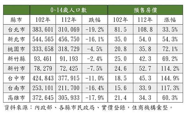 值得注意的是,台北市102年以來幼年人口減少近2成,跌幅為七都最高;同時,新案房價卻僅成長約3成,漲幅為各六都與新竹縣市中最低,顯示台北市人口少子化最嚴重,但房價表現也相對遜色不少。