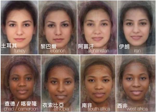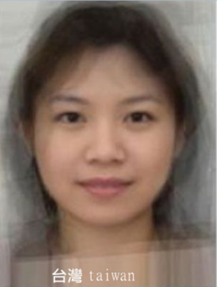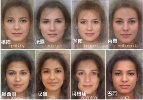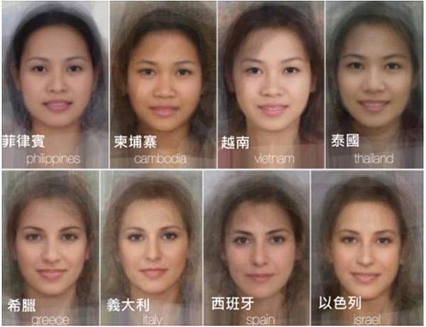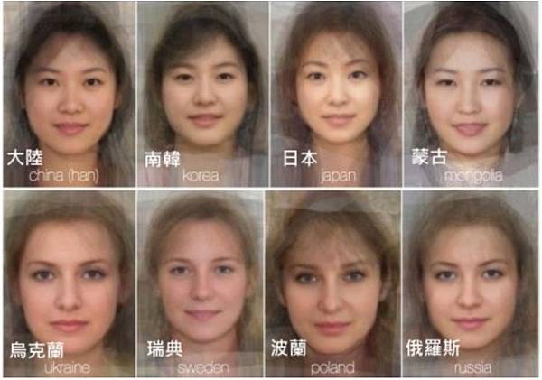 英國格拉斯哥大學心理學家收集全球41個國家或地區共射千張女性照片,透過一項電腦程式「合成肖像法」將多張照片重疊,得出各國女性的「平均樣貌」利用電腦程式計算出各國女性的「平均樣貌」,結果發現各國女性平均下來,皆擁有無瑕肌膚、美麗大眼,且看起來只有20歲左右。http://www.nownews.com/2013/09/29/91-2991130.htm
