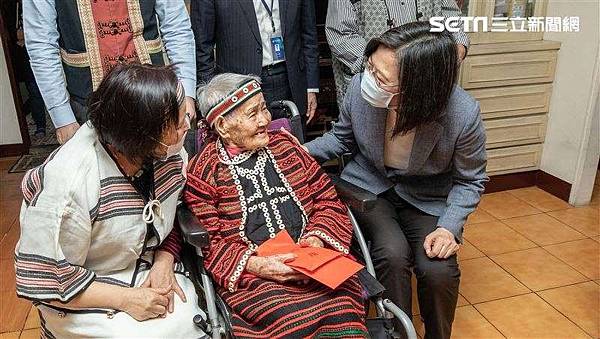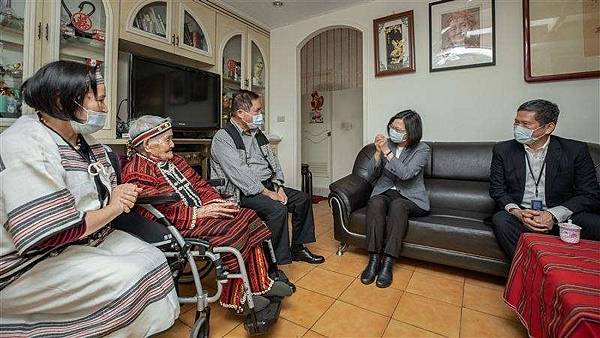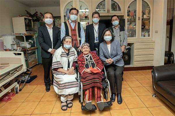 文面國寶林智妹是全國最後一位泛泰雅族的文面長輩,蔡英文總統曾於去年親自拜訪,問候生活起居、健康及長照情況。(總統府提供)