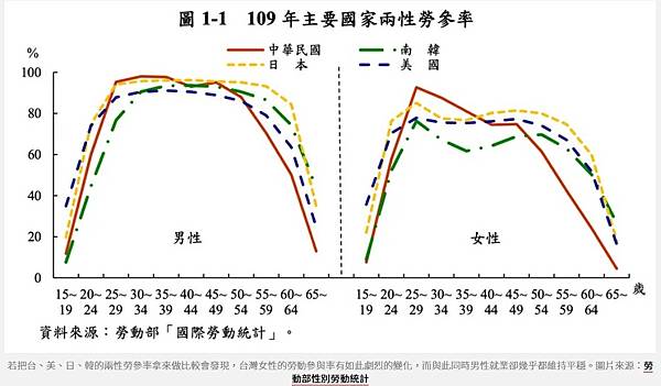 不過,台灣整體女性勞動力參與率部分,主要高峰仍在25歲至29歲,隨後逐步下降,50歲後低於美國、日本、韓國等主要國家。
