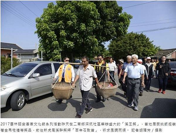 2017雲林詔安客家文化節系列活動昨天在二崙鄉深坑社區舉辦盛大的「溪王祭」,副縣長丁彥哲、立委劉建國等人會同鄉親挑飯担,重現先人挑扁擔裝豐盛菜飯祭祀溪王情境,到新虎尾溪畔祭拜「百年石敢當」,學習先人對萬物懷著感恩的心情,祈求溪水平靜不淹水,台灣風調雨順。