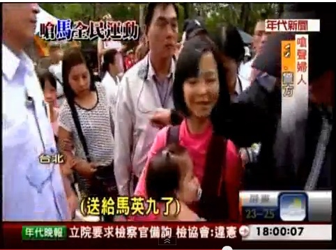 前天有婦人抱著孩子,向馬總統擲鞋(https://www.youtube.com/watch?v=VjUB_MNVtxM),特別引人注目。如果馬真有風度真的苦民所苦,應把婦人請來公開一談問其所苦。這種風度,必能讓馬九月政爭陰霾散去不少,民調扶正上升。
