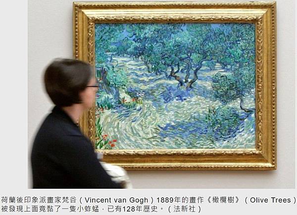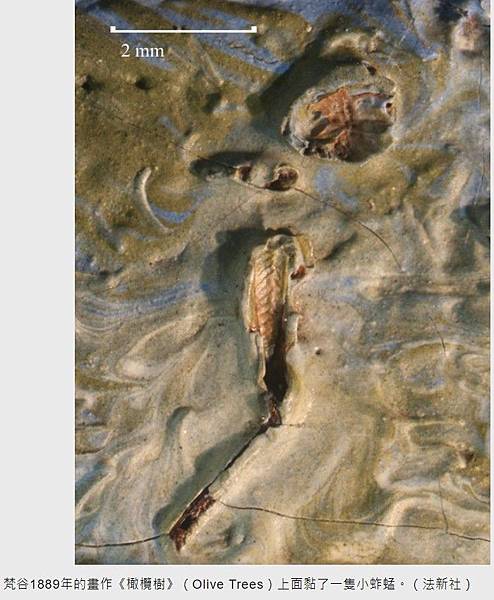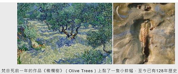 〔即時新聞/綜合報導〕當美國堪薩斯市尼爾森艾特金斯美術館(Nelson-Atkins Museum of Art),將世界知名的荷蘭後印象派畫家梵谷(Vincent van Gogh)1889年的畫作《橄欖樹》(Olive Trees)放在顯微鏡下觀察時,發現到令人意外的入侵者─竟有一隻蚱蜢在梵谷作畫時黏在畫布上,至今已有128年歷史!