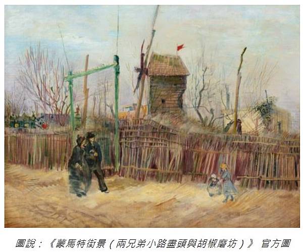 綜合外媒報導,《蒙馬特街景》是梵谷畫作中非常罕見的一系列作品當中的其中1件,該系列作品描繪了法國首都巴黎蒙馬特地區的一座建築「風車磨坊」(Moulin de la Galette),以及如俯瞰山頂、繪製首都景色等畫作,而《蒙馬特街景》的繪製時間為1887年春天。