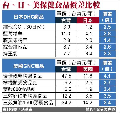 消基會挑選兩家美、日具代表性的保健食品品牌GNC和DHC,以官網同品項商品比價,發現台灣賣的價錢都較美、日貴得多。比如,美國GNC的「優佳視麗膠囊食品」在美國每罐賣廿一.九九美元(約六九五台幣),台灣賣二八五○元,價差達四.一倍最多。