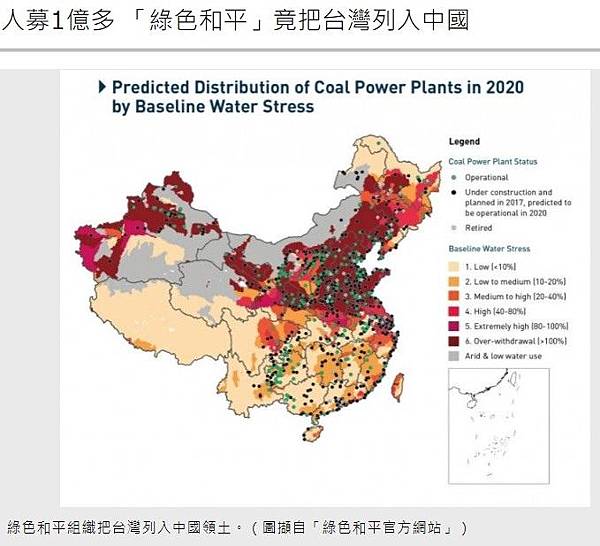 台灣人權促進會會長邱毓斌今(7)日在臉書發文,批評國際環保組織綠色和平在一份報告裡,將台灣放進中國地圖的一部分,讓綠色和平台灣分部的臉書粉湧進大批網友抗議「台灣不是中國!」綠色和平發表聲明,指出該報告中的地圖,來自一份中國綠色和平辦公室發表的《中國煤電產能過剩與水資源壓力研究報告》,但報告中沒有提到台灣,純屬地圖上的物質,資訊錯誤已更正,對此也深感抱歉。