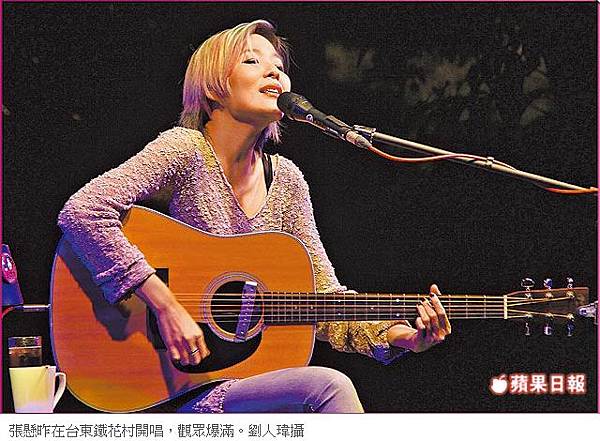 昨晚八時,張懸在台東 鐵花村舉行小型演唱會,這是她在國旗事件後首度演出,九百張門票全部售完,還有不死心的歌迷逗留外圍欣賞,也有歌迷戴國旗帽到場聲援、支持「做自己的張 懸」,戴國旗帽的歌迷喬安娜說,張懸不應被批評,她生長在台灣,本就以自己的國旗為傲,各國選手在競技場上比賽,不也以展現國旗為榮嗎?