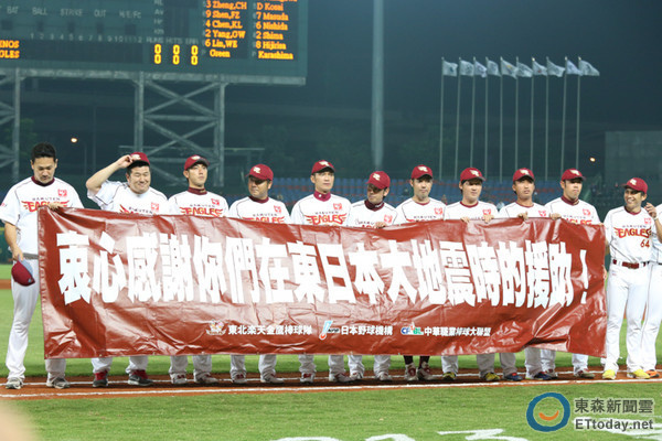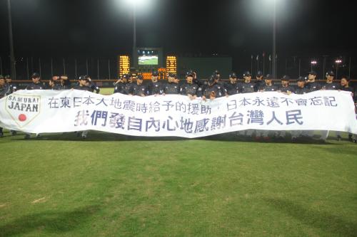 「衷心感謝你們在東日本大地震時的援助!」從中日對抗賽,到這次的亞洲職棒大賽,都能看到日本代表隊拿著感謝標語;樂天金鷹王牌投手田中將大也不例外,15日賽前和隊友站在一起,脫帽、鞠躬向台灣球迷表達感謝之意。