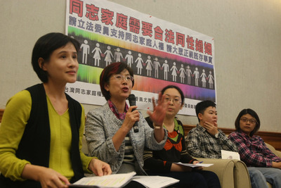 民進黨立委鄭麗君(左起)與尤美女、台灣同志家庭權益促進會副理事長游雅婷、女同志家庭代表大龜、女同志佛化婚禮當事人黃美瑜17日在立法院出席「同志家庭需要合法同性婚姻」記者會,立委表示,19日將在立法院召開公聽會,開放正、反兩方提出對「合法同性婚姻」的看法。