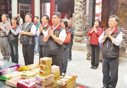 問神 新竹縣湖口鄉代表會遞補主席難產,現任主席鄭宏釗(前右二)12日提議至「顯聖宮」擲筊,最後由代表陳德木(右一)的7次聖筊獲媽祖欽點。(陳育賢攝) |