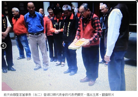 前天由顯聖宮董事長(右二)替湖口鄉代表會的代表們擲筊,選出主席。翻攝照片