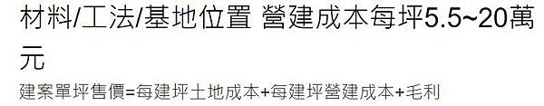 他表示,新北市最早營建成本一坪5萬元,這幾年大多拉高到一坪15萬元,如果回到一坪8、9萬元,那麼一坪省5、6萬元,以新北市的房價,就有降價一成空間。