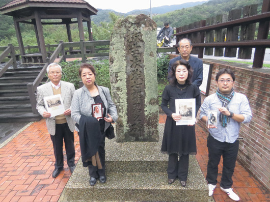 舊草嶺隧道日籍工程師吉次茂七郎的家屬,昨天在紀念碑前合影留念。