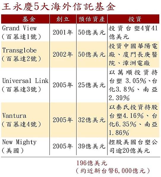 海外的部分,則是王永慶生前於2001年至2005年創立Grand View(豪景)、New Mighty(新威力)等海外5大信託基金,加上國內則成立長庚醫院、長庚大學、明志科大、勤勞社福基金會等6大公益財團法人,再以海內外集團事業公司交叉持股及基金會直接或間接投資控股方式,取得台塑集團的台塑、南亞、台化及台塑化等公司股權,牢牢控制市值4兆元的台塑集團。