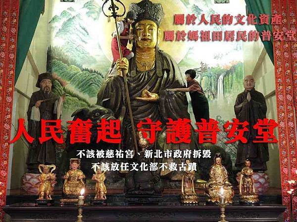〔記者翁聿煌、郭顏慧、趙靜瑜/綜合報導〕「誓死捍衛媽祖的家」、「朱立倫不要當古蹟殺手!」百年古剎普安堂因土地爭訟敗訴,請求新北市文化局列為古蹟緩拆又不可得,堂主李榮台與三十多位信眾及支持者昨天上午跪在市府前陳情;率隊的社運人士潘翰聲嗆聲,十六日強拆,支持者會「誓死守護」。