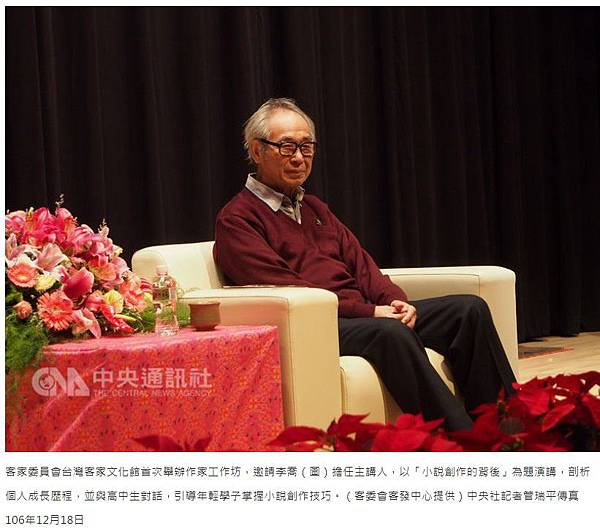 客家委員會台灣客家文化館首次舉辦作家工作坊,邀請李喬(圖)擔任主講人,以「小說創作的背後」為題演講,剖析個人成長歷程,並與高中生對話,引導年輕學子掌握小說創作技巧。(客委會客發中心提供)中央社記者管瑞平傳真 106年12月18日