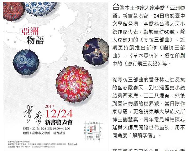 「亞洲物語」新書發表會12月24日早上10點,於台中文學館研習講堂(西區樂群街38號)登場,敬邀各界先進前來與會交流,活動詳情後續將公佈於「李喬書房」臉書粉絲頁。