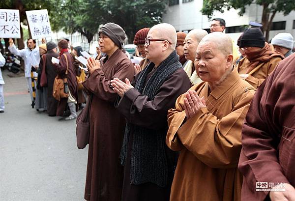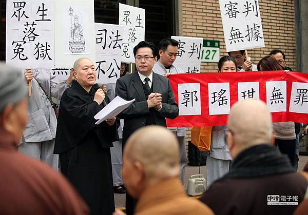 來自北、中的數十位法師6日前往台北高院前抗議,聲援涉嫌收賄遭判刑定讞的交通部前部長郭瑤琪和內政部前政務次長顏萬進,悟善禪師(中排左著黑衣)痛批司法體制已成炮製冤獄的造業工具,並帶領眾法師表達郭瑤琪無罪、顏萬進無罪的心聲。(王錦河攝)