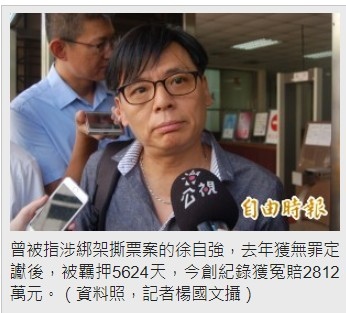 被羈押5624天 徐自強創紀錄獲冤賠2812萬元