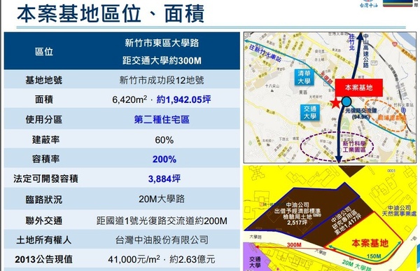 世邦魏理仕表示,中油決定再度活化資產,辦理「新竹市成功段及大學段等五筆土地設定地上權案」,總面積1,460坪,正臨新竹巿大學路,鄰近國道一號新竹交流道、陽明交通大學、清華大學,適合興建企業辦公大樓、出租住宅、旅館,更配套提出彈性方案,地上權存續年限為50年,若無違規事項,期滿可續約一次、最長增加20年的承租權利,合計最高70年。