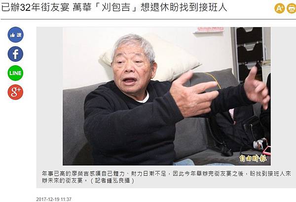 已辦32年街友宴 萬華「刈包吉」想退休盼找到接班人 從一開始請五桌,到最多曾經請過1千桌以上-除夕前一天設宴,辦4天到初二,總共請兩百桌-街友看到菜餚都會搶食,甚至發生爭執,所以接班人也要有耐心,更不能發脾氣- https://goo.gl/LDgGfy