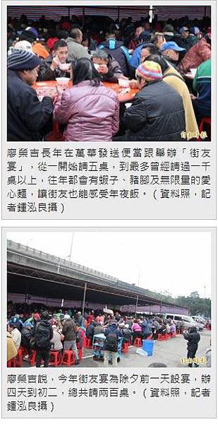 人稱「刈包吉」的台北市萬華區刈包店老闆廖榮吉,因為從32年前開始,痛心街友流落街頭,因此每年除夕前後都會舉辦街友宴,辦桌六百桌宴席讓街友飲宴;但他日前表示自己年老體衰,去年更因脊椎老化動手術,現在急需要找接班人,將這個愛心盛宴繼續傳承下去。不過廖榮吉的兒子廖輝煌今天卻跳出來,表示父親每年為了街友宴都無法陪伴家人,近年來又受到病痛所苦,街友宴不是他父親的專利,大家可以將愛心改為捐贈物資,「讓我爸爸可以好好休息吧!」