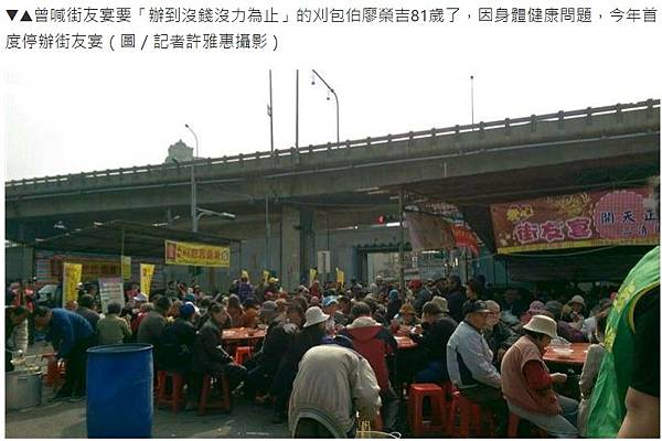 「來唷!來吃飯囉!」每逢過年從小年夜開始,在萬華河濱公園廣場總會聽到刈包伯廖榮吉嘹亮吆喝喊吃飯的聲音,然而今年已成絕響。刈包伯81歲了,年事已高,加上骨質疏鬆脊椎開刀、心臟裝支架後,體力大不如前,曾經對自己說「街友宴要辦到沒錢沒力為止」,現在阿伯是真的沒體力了,透過《三立新聞網》跟大家說惋惜,所有足足能一次辦滿80桌的工具也都得出清大拍賣。獨/曾喊「辦到沒錢沒力為止」81歲刈包伯停街友宴賣工具 https://bit.ly/3jAMPE4