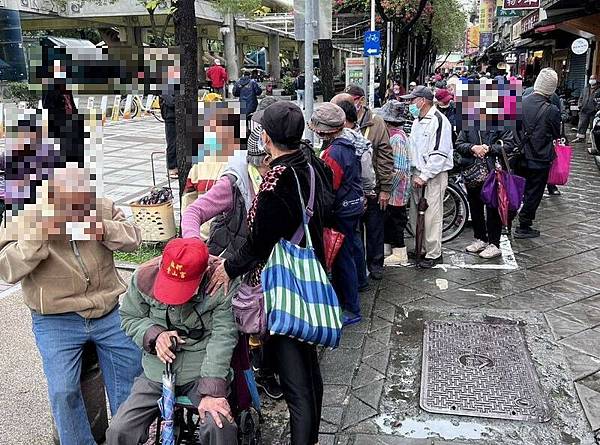 今日早上10時,龍山寺前現場排隊領便當的人數突破百人,年事已高的刈包吉在工作人員協助下現場發送,許多街友民眾都對他表達感謝之意。