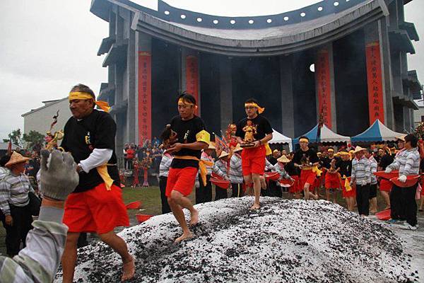 「過!過!過!」宜蘭縣五結鄉「二結王公文化節」今天上演重頭戲「過火」,廟埕堆燃1萬2千台斤的木炭,信徒或舉令旗、或捧神明或扛神轎赤腳踩過,民眾圍觀驚呼。