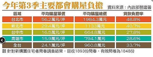 其中雙北市民最辛苦,今年第三季新北市購屋總價一千一百三十三萬元,創歷年新高,台北市購屋總價一千九百八十四萬元,較上季減少僅一個百分點,導致房貸負擔率超高,台北市購屋族每月薪水近一半要扛房貸,新北市則須花月薪四成付房貸。