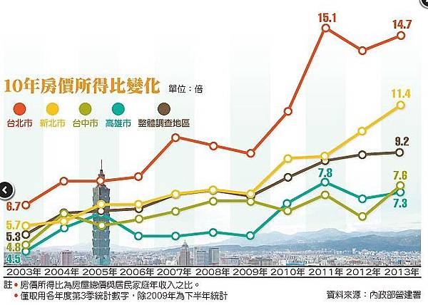 央行、財政部陸續對國內高房價示警,十二月初央行副總裁楊金龍曾表示:「一般房價所得比五倍是合理的,今年第二季台北市房價所得比十二點四倍太高。」但昨公布最新數據顯示,台北市房價所得比再度攀升至十四點七,僅次於二○一一年第三季的十五點一,新北市則以十一點四,創下新高紀錄。而房價所得比是指房屋總價與居民家庭年收入之比。