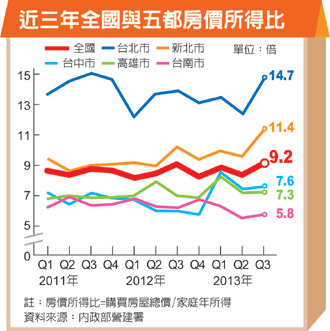 據內政部統計,六大都會區房價所得比為台北市16.22倍、新北市12.85倍、桃園市7.87倍、台中市11.26倍、台南市9.20倍、高雄市8.89倍。