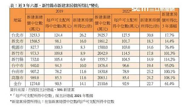 591新建案說,調查總價最為親民的桃園市,隨著機捷通車,沿線湧進大量雙北購屋族,帶動包括青埔、龜山A7等地的新案行情飛漲,房價所得比也來到14.6倍,漲幅高達8成。不過若將眼光轉往新竹,會發現一山還有一山高,像新竹縣過往雖有新豐、湖口等平價區塊,搭配竹科就業帶動收入大增,房價所得比僅6.9倍,堪稱全台買新屋的天堂;沒想到近期在以竹北市為首的高價案領軍下,不僅新屋總價3年大漲逾8百萬,隨著消費支出上升,壓縮家庭可支配所得,房價所得比也因而飆升。