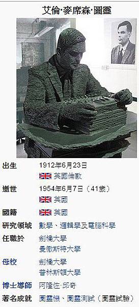 艾倫·麥席森·圖靈,OBE,FRS(英語:Alan Mathison Turing,又譯阿蘭·圖靈,Turing也常翻譯成涂林或者杜林,1912年6月23日-1954年6月7日),是英國數學家、邏輯學家,他被視為電腦科學之父。