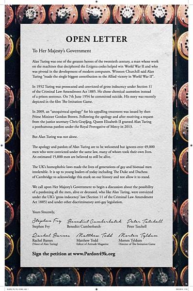 英國政府當年以同性戀相關罪名起訴圖靈並定罪,導致他自殺身亡,正式向艾倫·圖靈公開道歉。