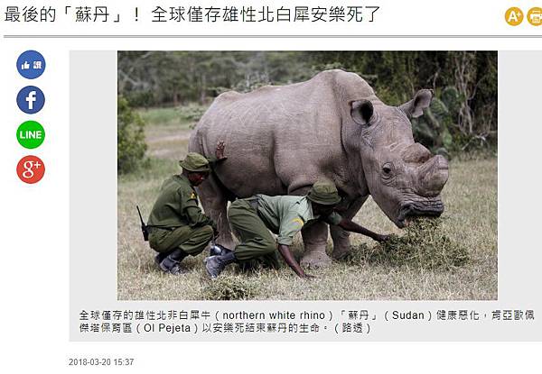 分享最後的「蘇丹」! 全球僅存雄性北白犀安樂死了到Facebook 分享最後的「蘇丹」! 全球僅存雄性北白犀安樂死了到Line 分享最後的「蘇丹」! 全球僅存雄性北白犀安樂死了到Google+