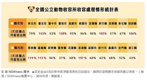 ▲目前全台5成的縣市都瀕臨滿員或已經超收,擁擠的空間讓流浪貓狗難以喘息。(製表/NOWnews製圖中心,資料來源:農委會)© 由 NOWnews 提供 ▲目前全台5成的縣市都瀕臨滿員或已經超收,擁擠的空間讓流浪貓狗難以喘息。(製表/NOWnews製圖中心,資料來源:農委會)