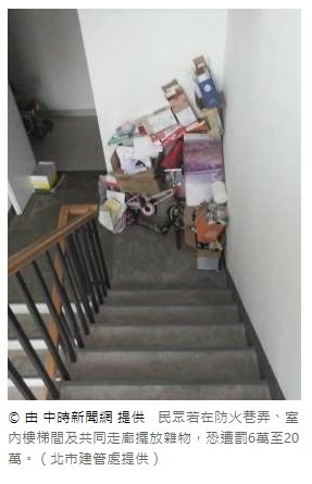 民眾若在防火巷弄、室內樓梯間及共同走廊擺放雜物,恐遭罰6萬至20萬。(北市建管處提供)© 由 中時新聞網 提供 民眾若在防火巷弄、室內樓梯間及共同走廊擺放雜物,恐遭罰6萬至20萬。(北市建管處提供)