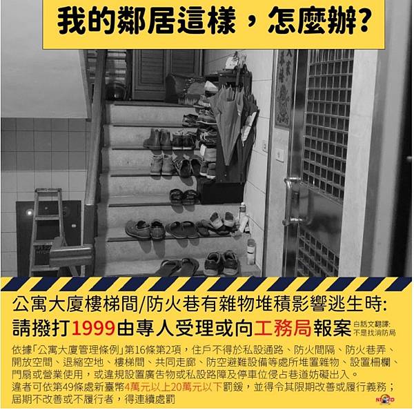 對於討論這麼熱烈,很多人都質疑,難道在台灣這些作為都無法可管嗎?新北市消防局經營的臉書社團「臉書消防發爾麵」也跳出來回應,表示其實這樣的狀況除了可以請管委會、大樓管理員調解處理外,也可以撥打1999或是跟工務局報案,依照「公寓大廈管理條例」,不得於私設通路、防火間隔、防火巷弄、開放空間、退縮空地、樓梯間、共同走廊、防空避難設備等處所,堆置雜物、設置柵欄、門扇或營業使用。