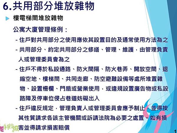 王姓律師表示,依公寓大廈管理條例,各樓層電梯間、樓梯間、共同走廊都屬公共空間,住戶不得據為私有,就法令觀點,擺鞋子鞋櫃、腳踏墊等雜物,若造成別人絆倒、滑倒危險,難保不會吃上官司,住戶最好勿任意置放雜物。