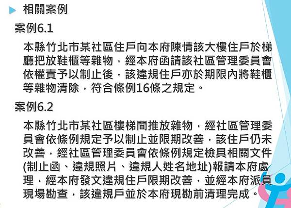 東區一處大樓管理委員會表示,依法門廊、樓梯都不得堆置雜物,社區規約就要明文訂清楚,規定若占用公共空間,先照相公告一段期間,逾期仍未改善,由管理委員會派人清除「不得異議」,且費用由該住戶負擔。