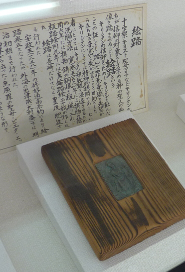 “為查明基督徒身份,長崎1629年采用踐踏十字架做法,起初使用木雕十字架聖像,1669年采用教堂抄來的20個青銅十字架聖像。每年1月4日、9日,疑似基督徒者均被帶到青銅十字架面前,令其從上面踩過;凡拒絕踐踏者均遭驅逐,下次被捉時若仍拒絕踐踏便慘遭拷打。日本基督徒曾於1637年反抗,後遭軍隊鎮壓。”